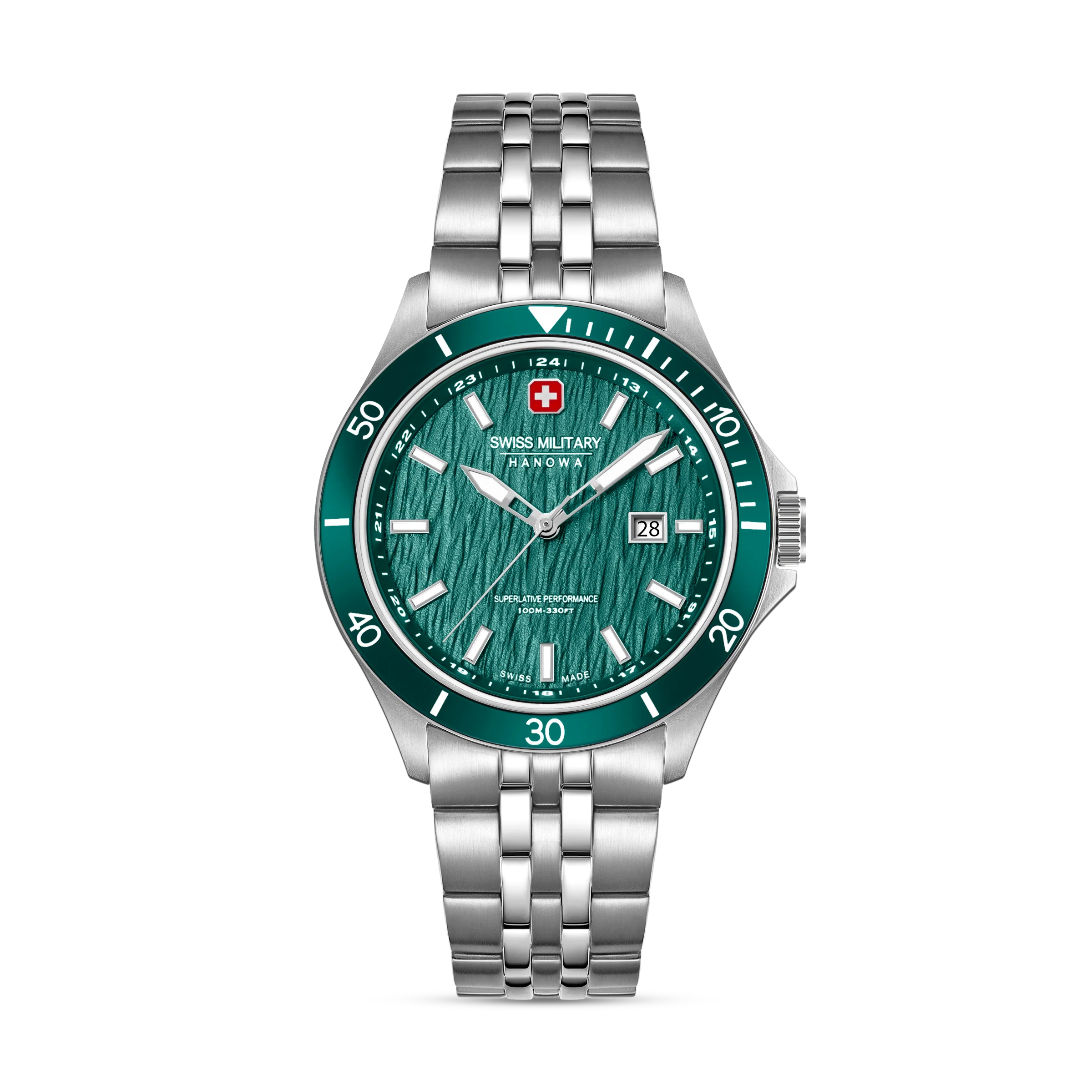 Swiss Military Hanowas Flagship Elements väcker äventyrsandan och är en djärv hyllning till rå energi och precision. Dess jordgröna, hydrauliskt präglade urtavla – inspirerad av jordelementet – frammanar naturens styrka och stabilitet, inramad av ett robust 42 mm-boett byggt för hållbarhet. Safirglaset, 10 ATM-vattentåligheten och ett pålitligt kvartsurverk med tre visare och datum ger denna klocka den känsla den med rätta förtjänar. Varje modell är en del av en familj på fyra personer och är inspirerad av ett av de fyra elementen, vilket gör Flagship Elements-kollektionen till en sann hyllning till naturens kraft.