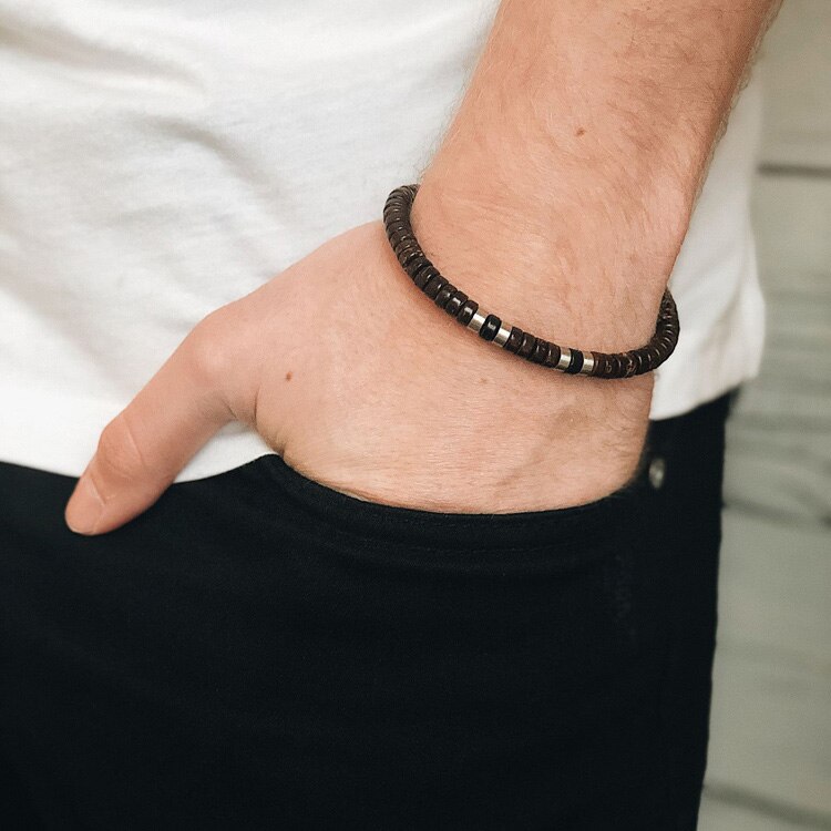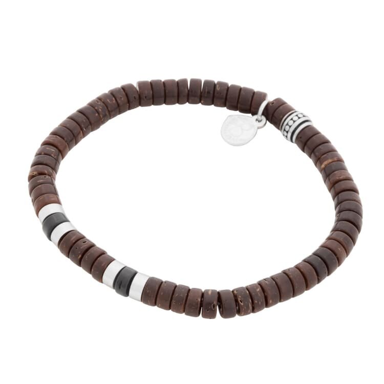 Snyggt kularmband tillverkat av skalet från kokosnötter, som ger en härligt organiska färgskiftningar i brunt och svart. Dekorerat med nätta detaljer i stål.