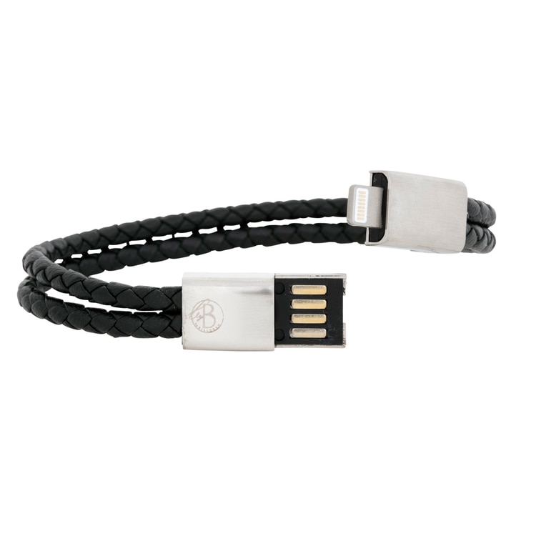 Flätat läderarmband utrustat med uttag för iPhone - så du alltid har en laddkabel nära till hands! Koppla bara armbandet till en strömkälla, t. ex. en powerbank, och ladda på. Längd: 19 cm.