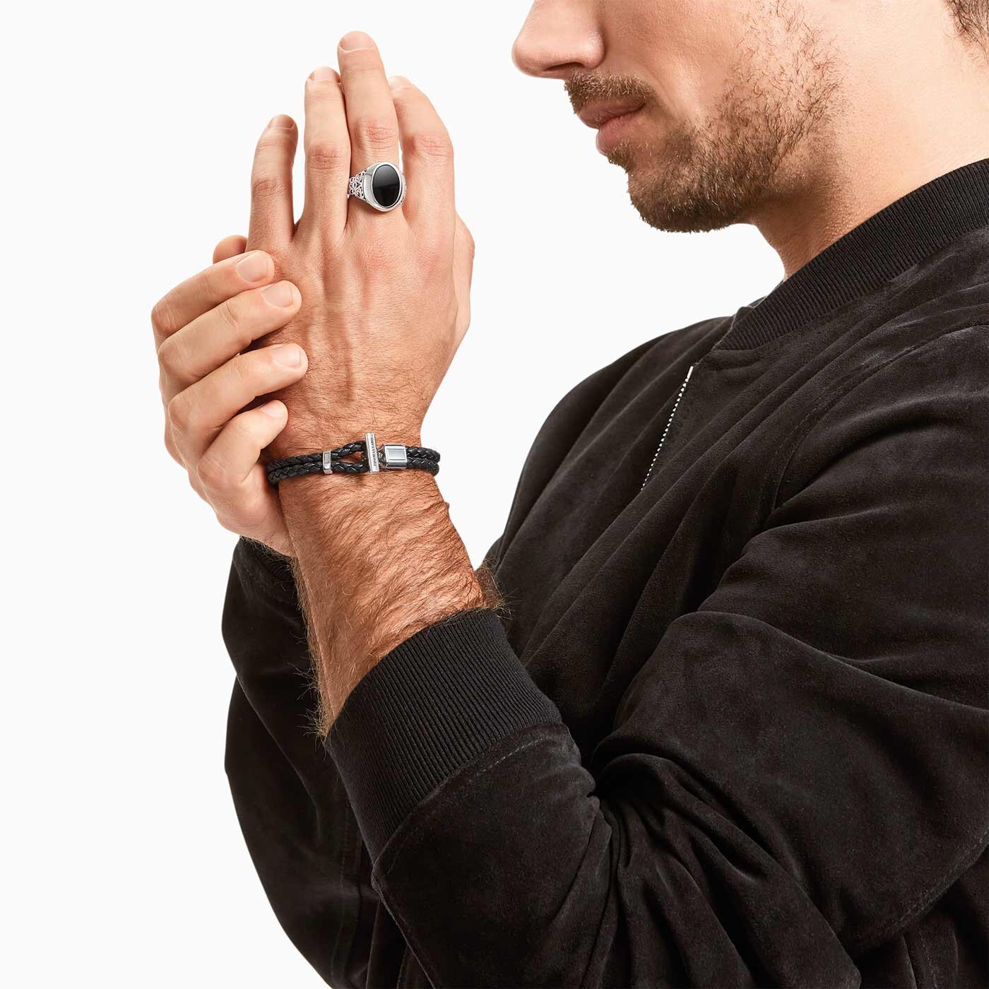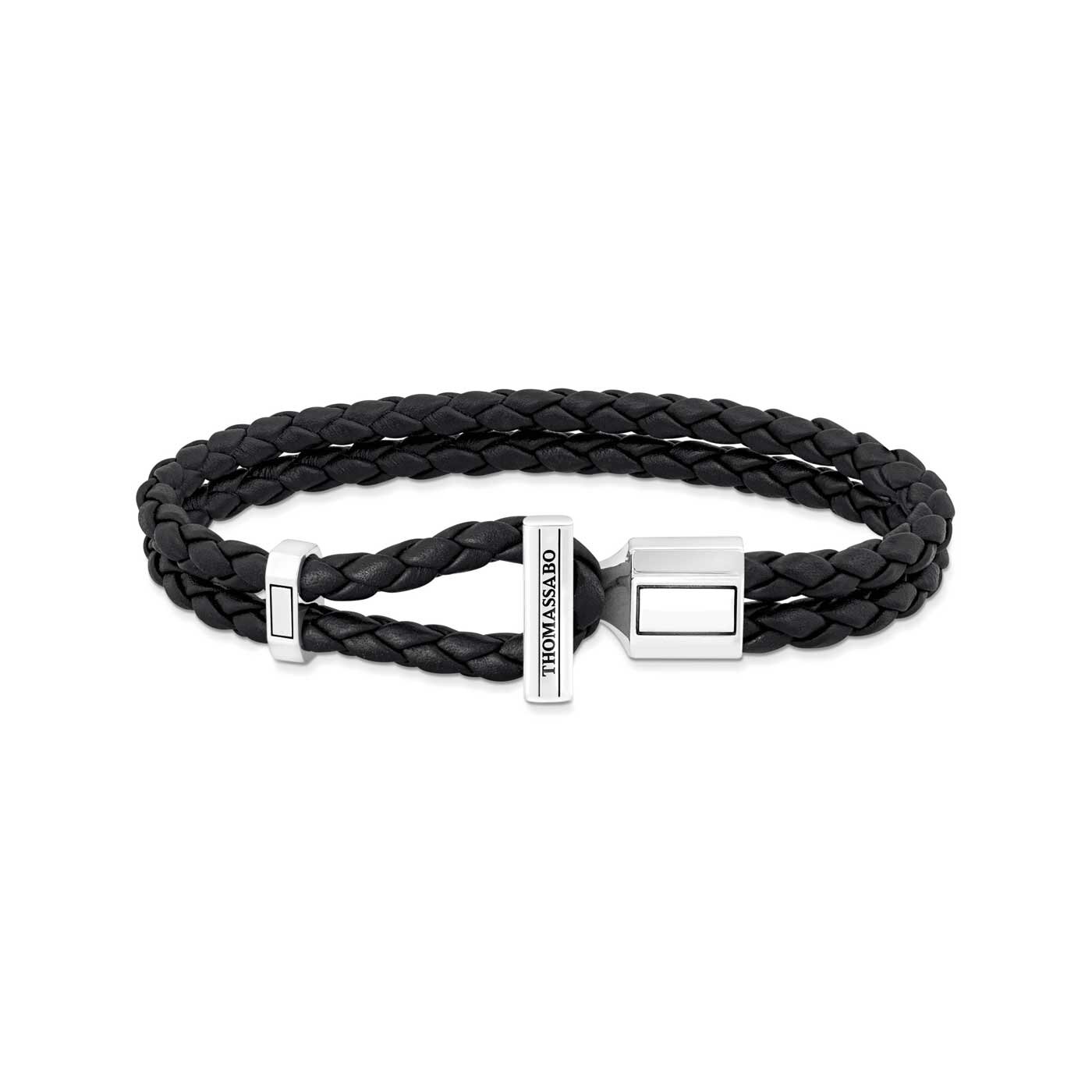 Det stilrena armbandet i urban design består av två svarta flätade läderarmband med 4 mm i diameter. Det markanta stavlåset i återvunnet, svärtat silver är utsmyckat med fina graverade linjer.