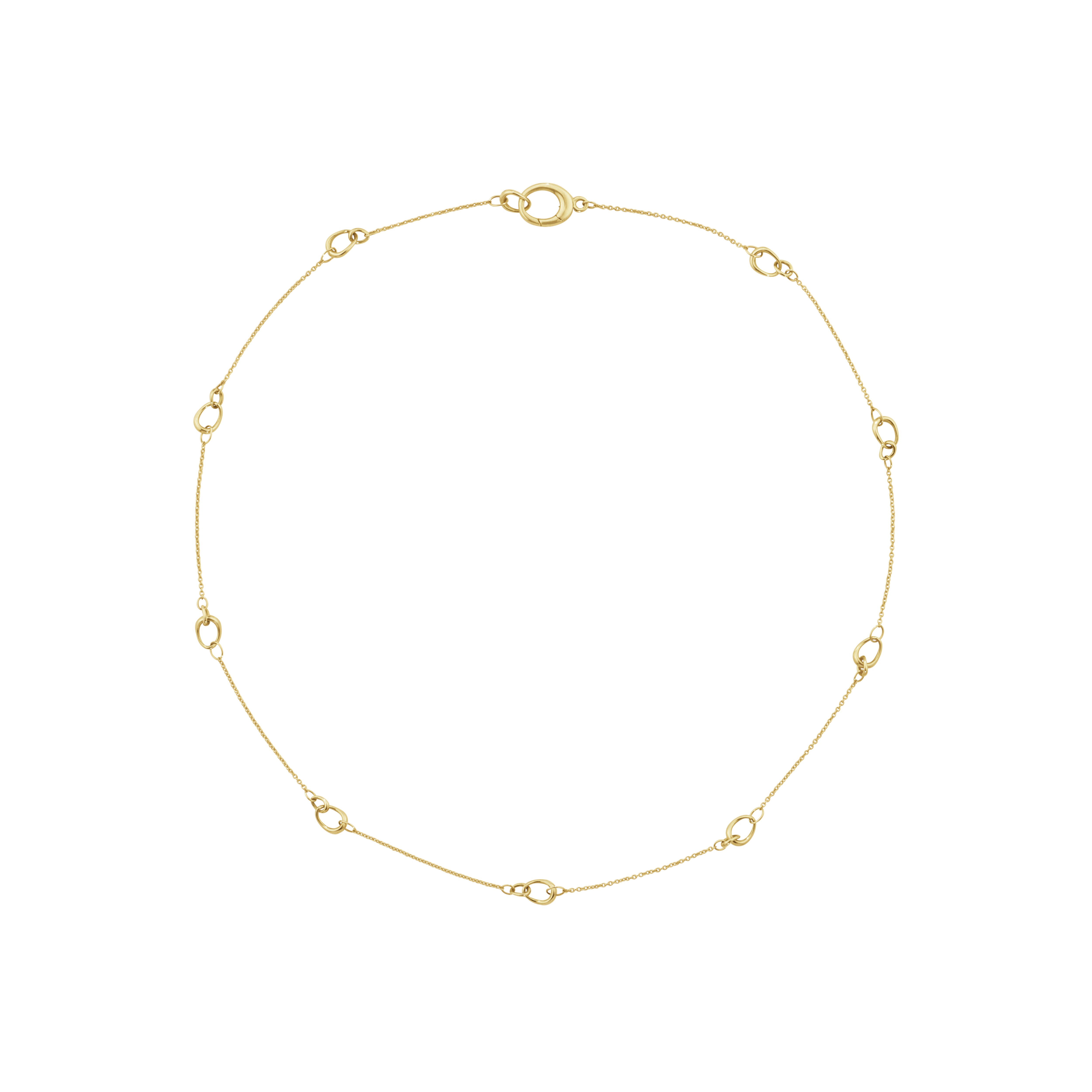 En tunn guldkedja kombineras med större, dekorativa ringar som harmoniskt fördelas längs kedjan. Smycket vilar elegant mot halsen och erbjuder en sofistikerad och mångsidig stil som passar både till vardag och festligare tillfällen. Halsbandet är designat av Jacqueline Rabun och speglar den tidlösa minimalism som kännetecknar hennes smycken.