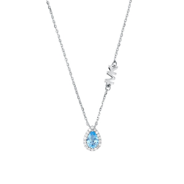 Elegant halsband i sterling silver, utsmyckat med ett dekorativt, droppformat, hänge med en blå sten. Längs kedjan sitter den karaktäristiska logotypen.