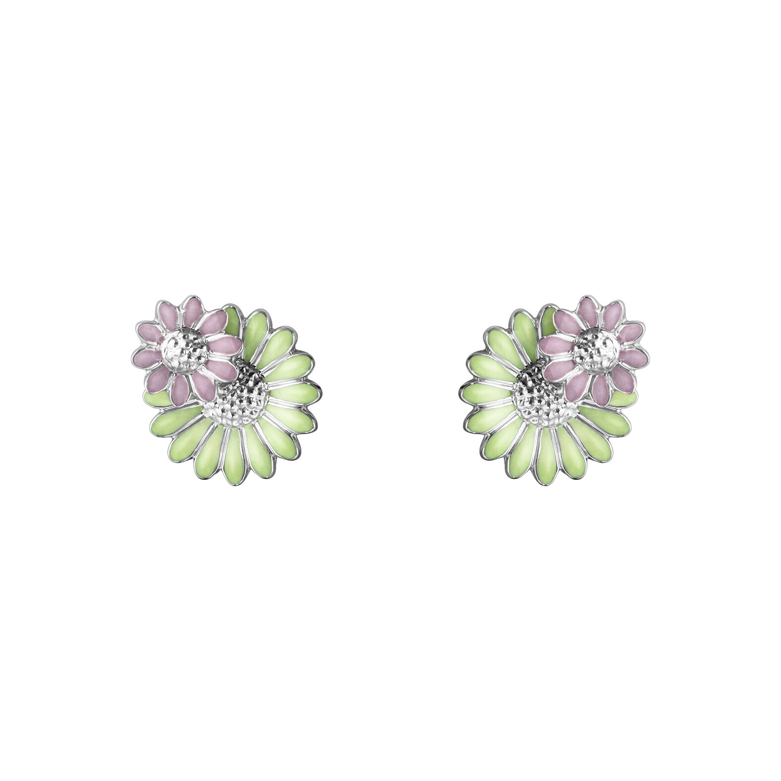 Söta örhängen med tusenskönor i två lager, tillverkade av rhodiumpläterat sterlingsilver med olika nyanser av grön och rosa emalj. Inspirerad av den ikoniska Daisy-kollektionen, här i ett designsamarbete med Stine Goya.